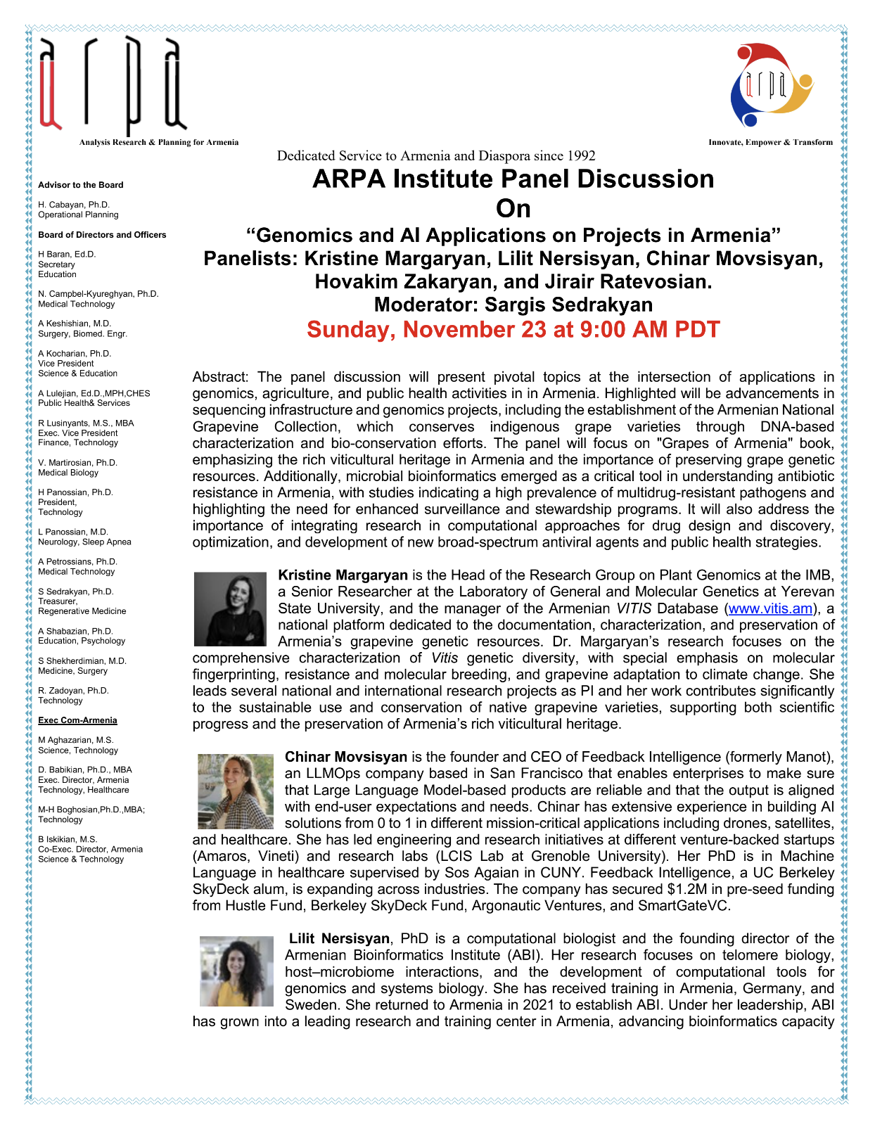 ARPA Institute (Analysis Research & Planning for Armenia) is a non-profit tax-exempt organization under section 501(c)(3), founded in 1992 in Los Angeles, California.