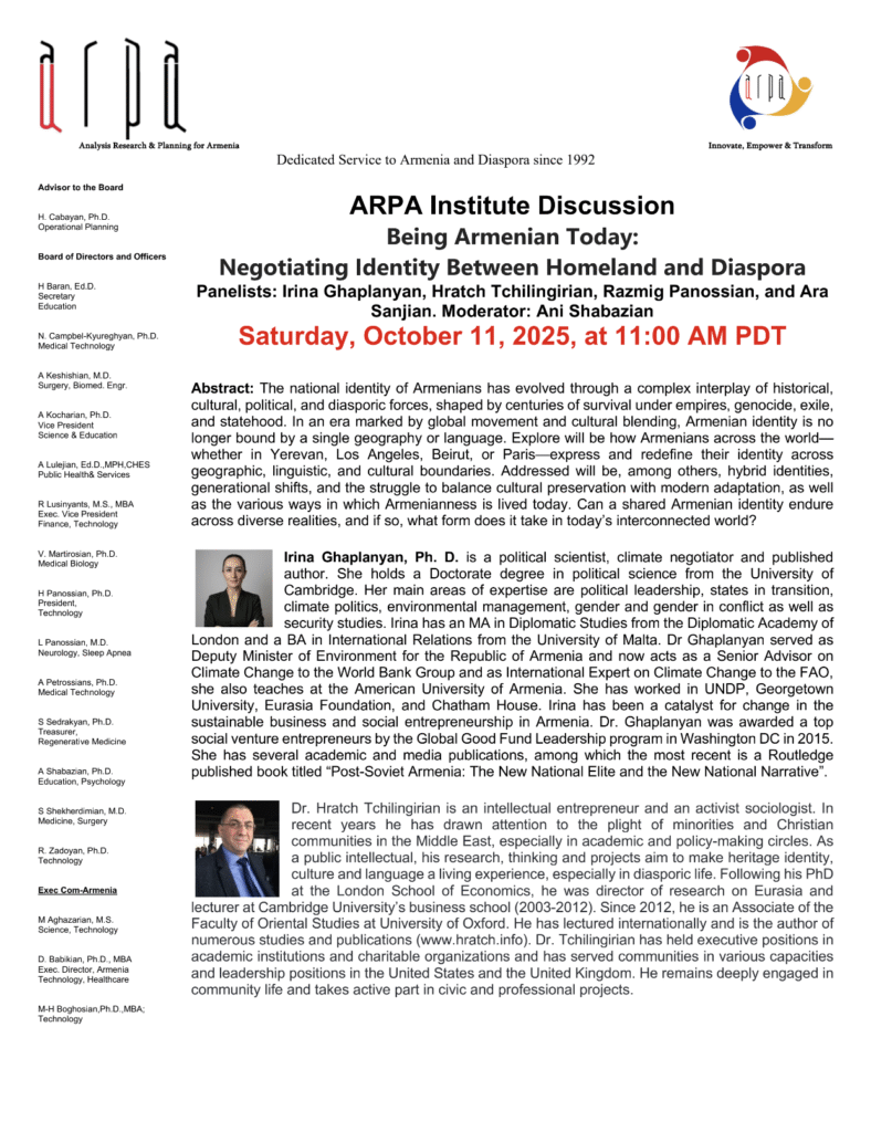 For the past 20 years, ARPA Institute has provided hundreds of free Community lectures, conferences, seminars and panel discussions bringing like-minded people together to hear from experts and scientists, all working for the betterment understanding of issues related to Armenia or Armenians.